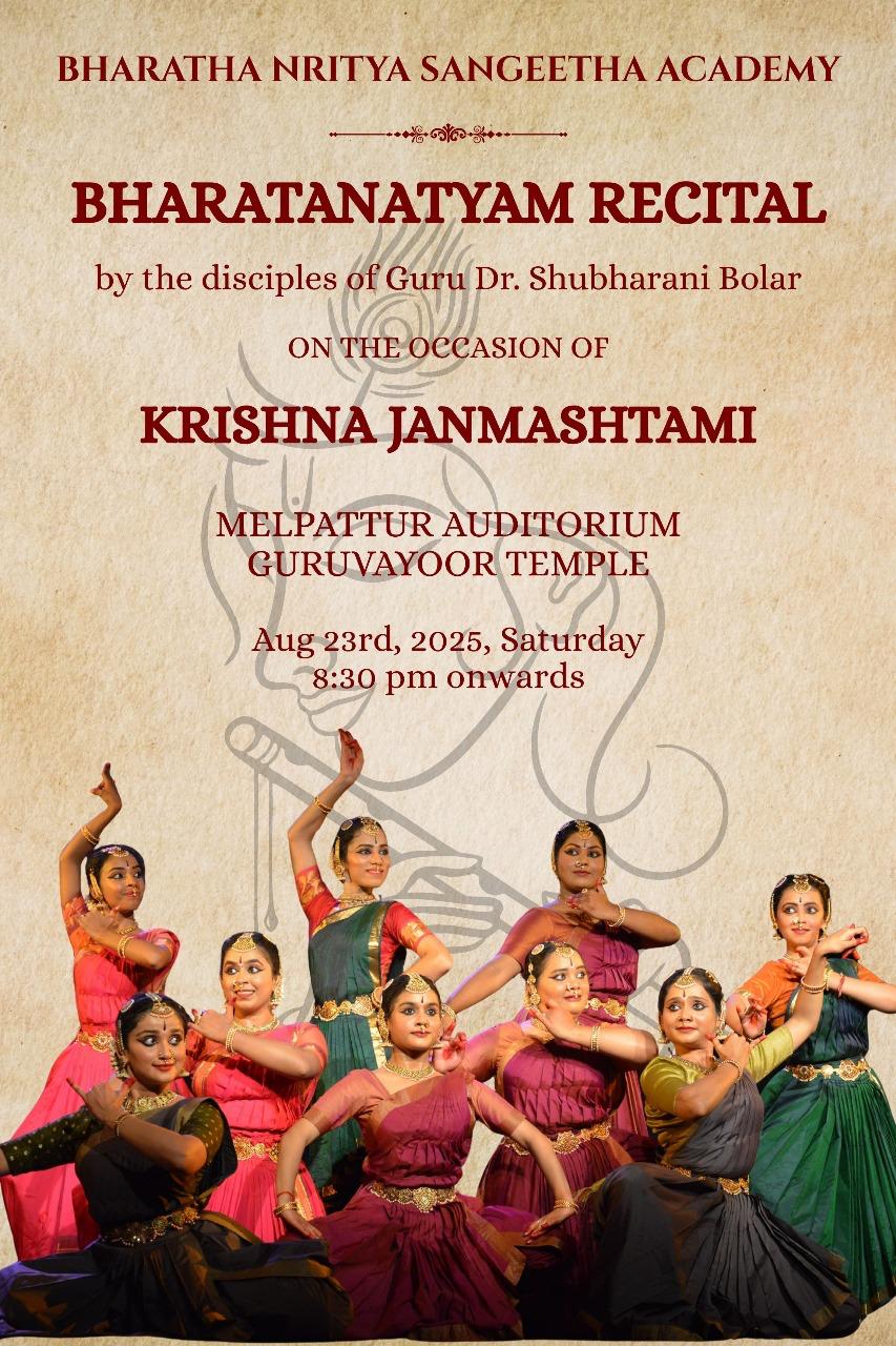 On the auspicious occasion of Krishna Janmashtami on 23rd August 2025, students of Bharata Nritya Sangeetha Academy (BNSA) offered a special Bharatanatyam performance at the revered Sri Krishna Temple, Guruvayur. Through expressive abhinaya and rhythmic choreography, the students depicted stories from the life of Lord Krishna, celebrating his divine birth with devotion and artistry. The performance was a humble offering at the lotus feet of Lord Guruvayurappan, filling the temple with a festive and spiritual atmosphere.